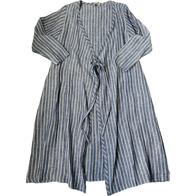 Size 着丈108cm. 身幅(タイを結んだ際)66cm 肩幅40cm 54cm LINEN 100% DENSELY LINEN TIE ROBEは、爽やかなストライプが目を引くタイローブです。リネン素材ならではの通気性があり、これからの季節にぴったりのアイテムとなっております。シルエットを美しく演出し軽やかな着心地ながら、しっかりとしたクオリティを感じられる一着です!リラックスできるデイリーユースはもちろん様々なコーディネートを楽しんでいただけます。自分だけのスタイルにぜひ取り入れてみてください。