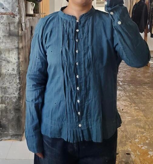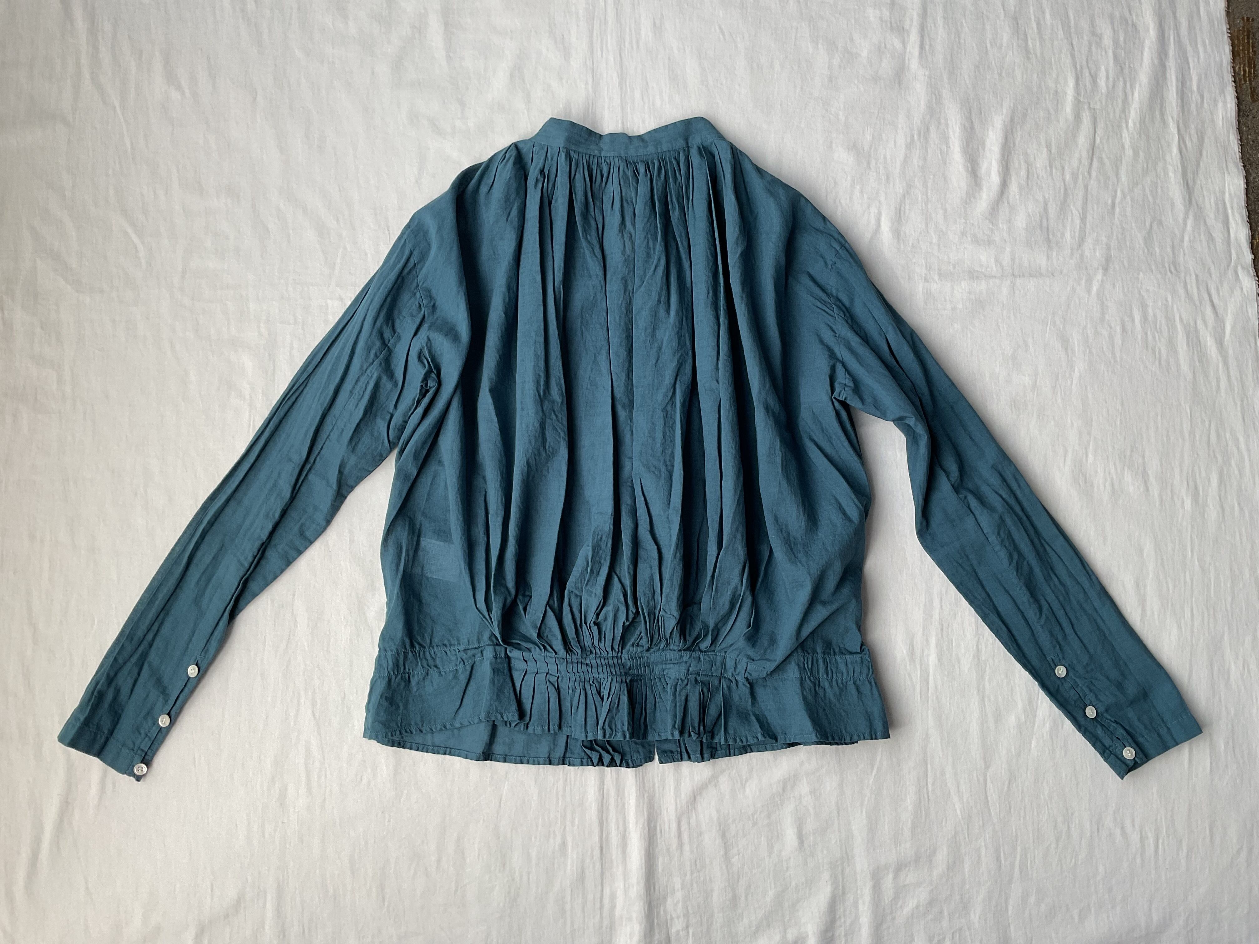 腰回りのギャザーが特徴的な薄めのカラーブラウスです。