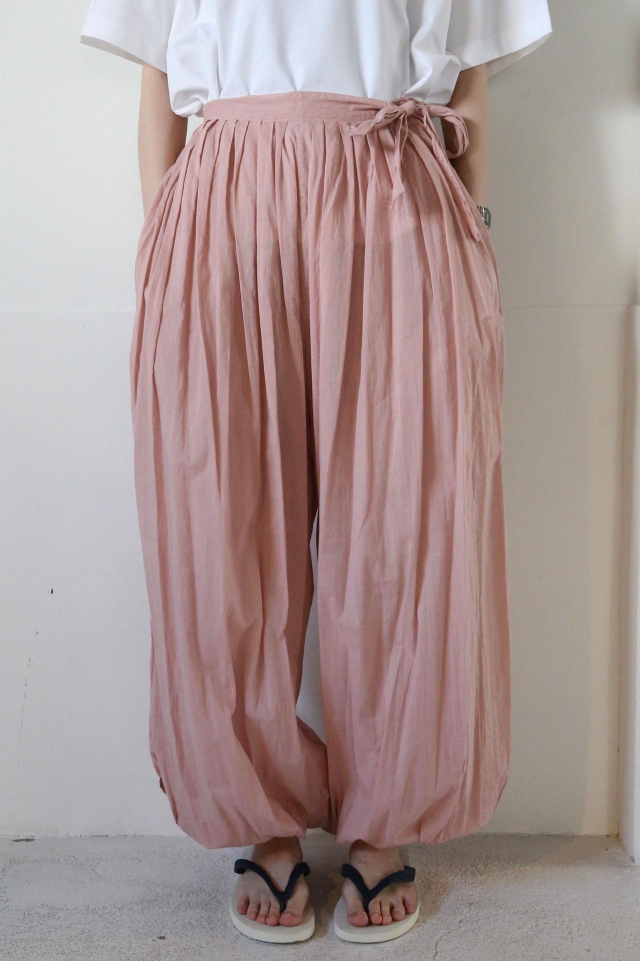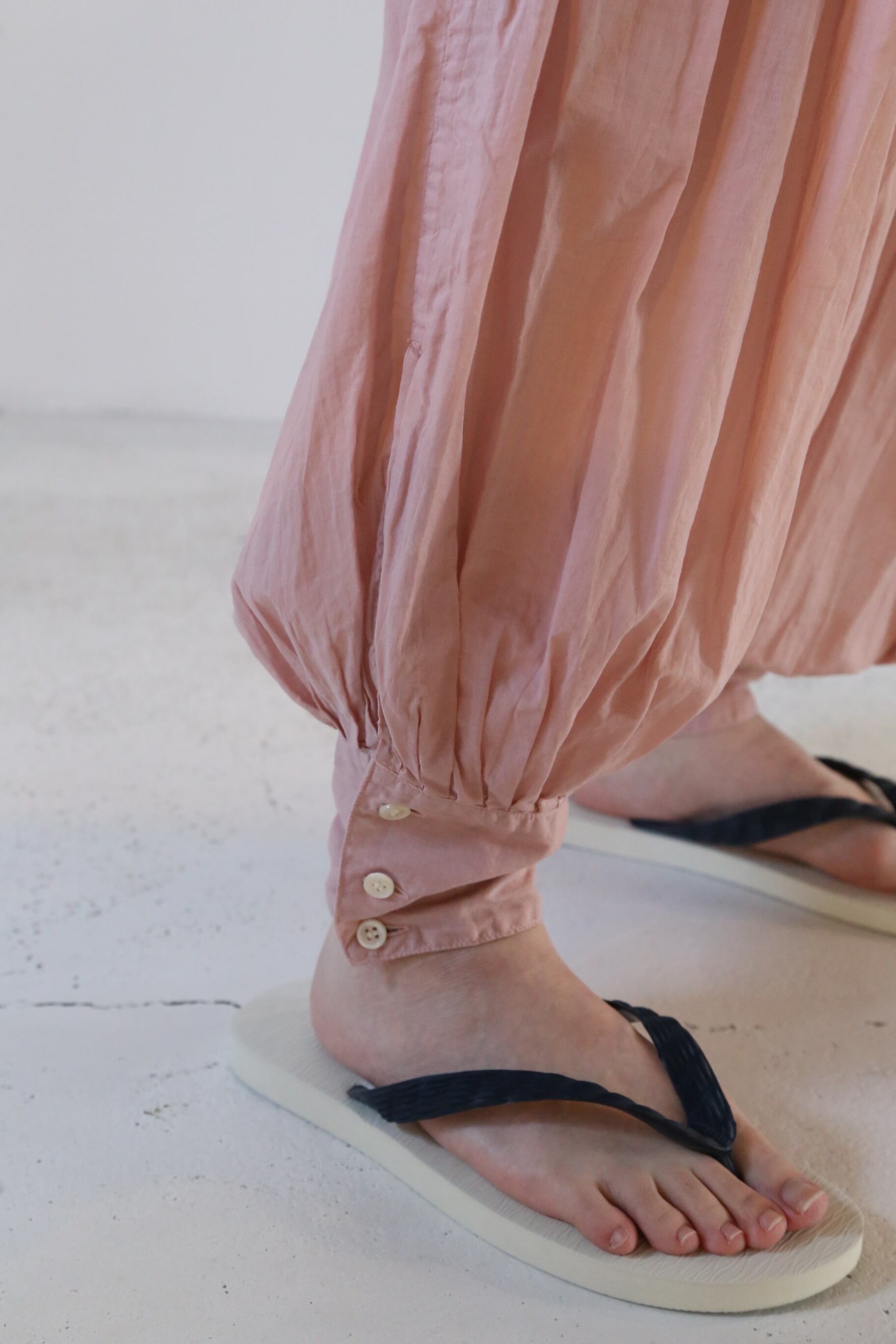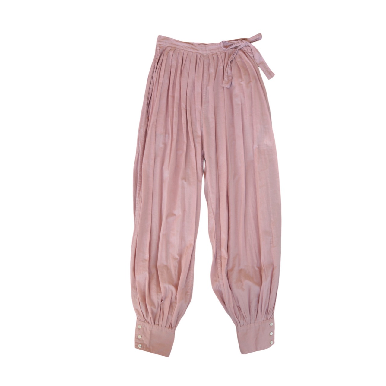 裾がきゅっと絞られたデザインと、着る人を選ばない落ち着いたピンクカラーが可愛らしいパンツです。