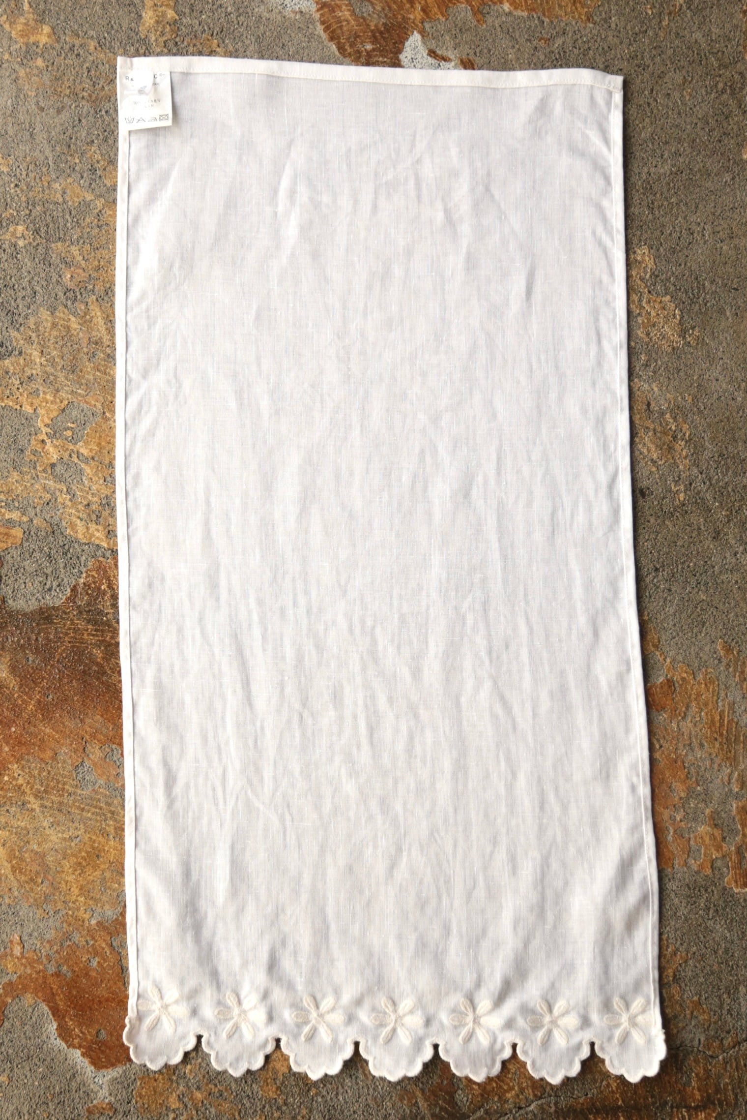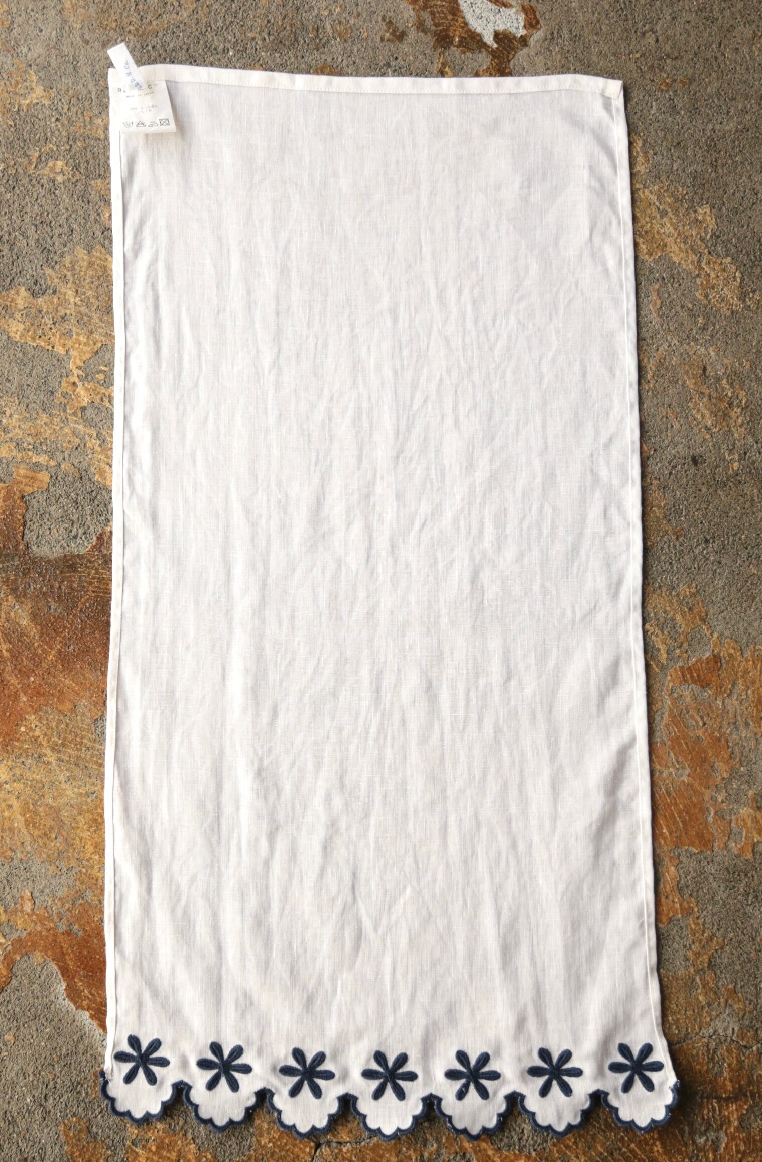 ネップの入った独特な生地感と、使うほどに味の出る風合いは長くお楽しみいただけます。可愛らしいscallop刺繍が印象的な一枚、お家の彩りにいかがですか?