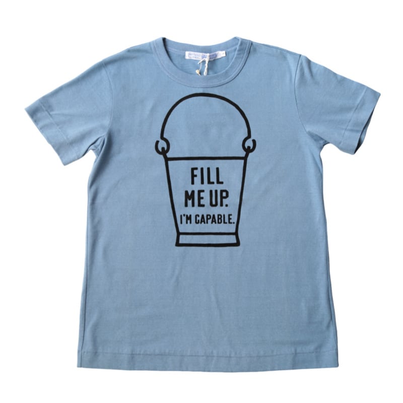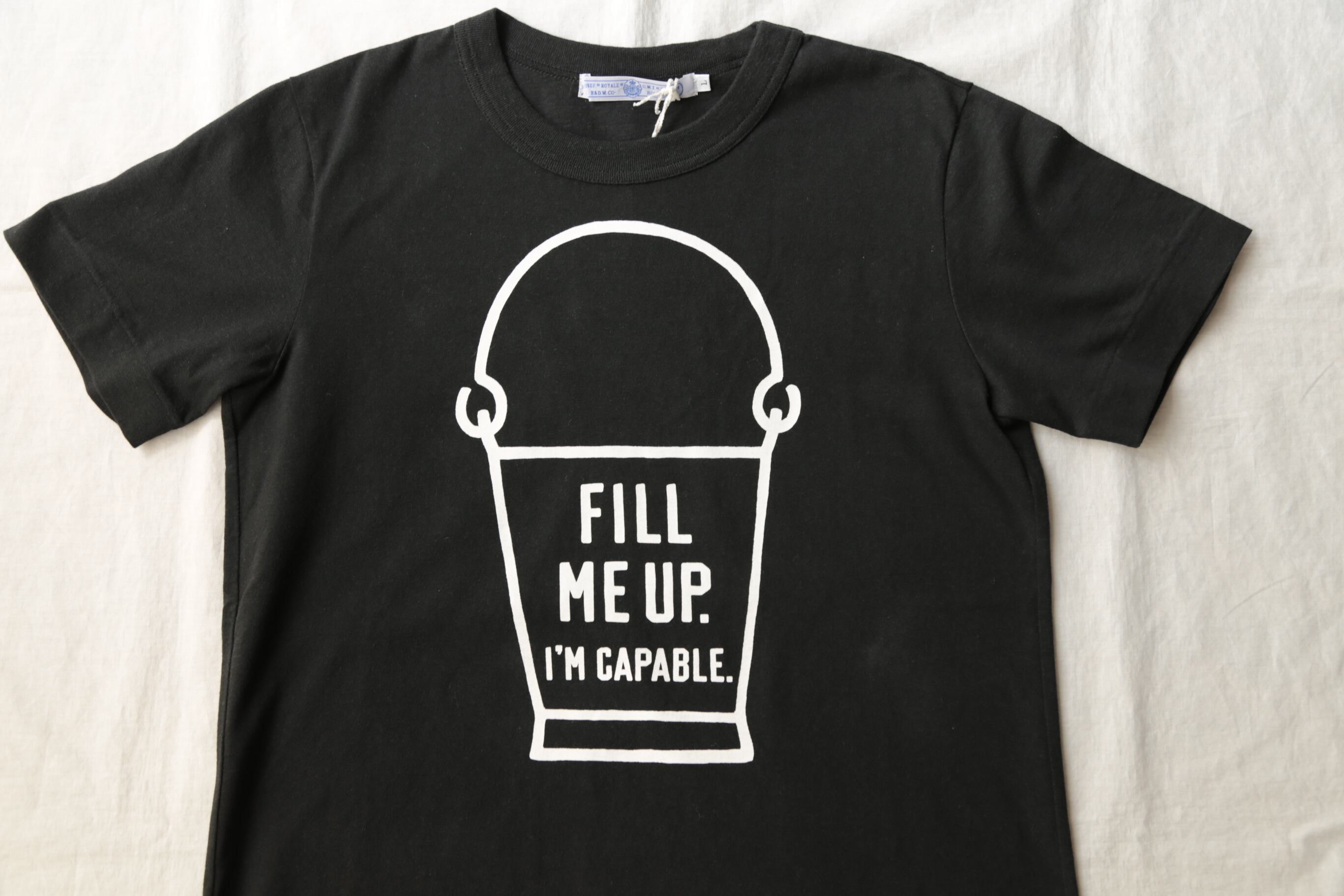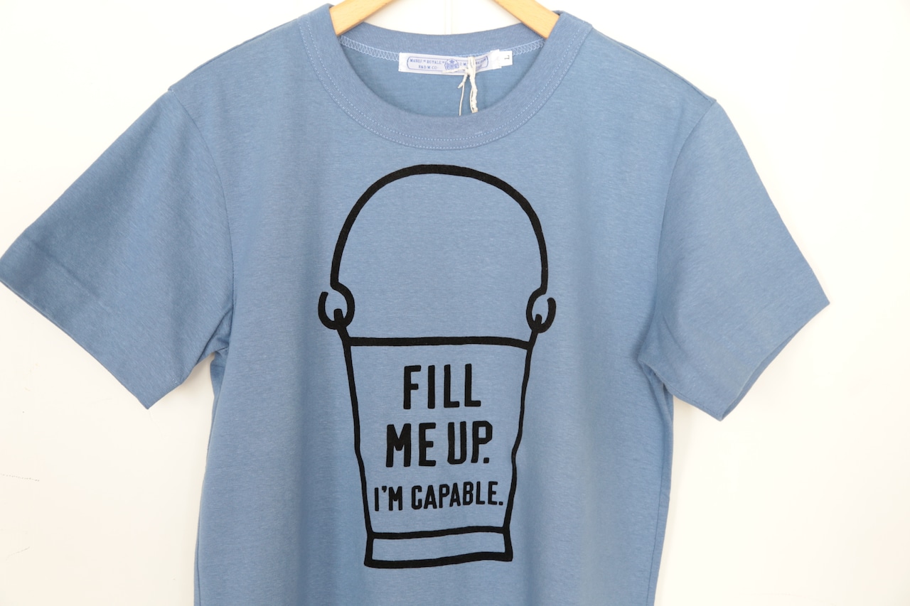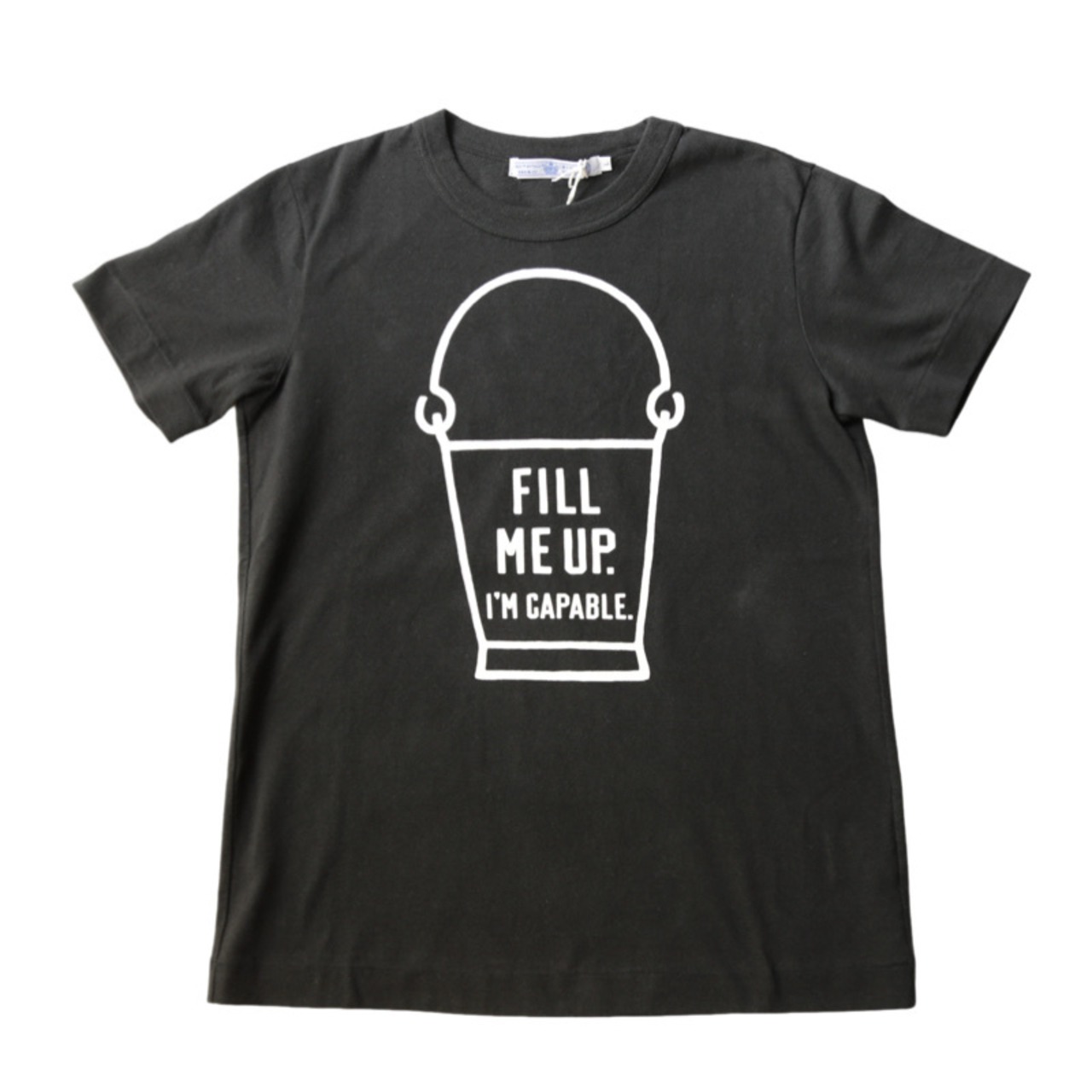 バケツのイラストにFILL ME UP TEEのロゴが際立つFILL ME UP TEE。シンプルでありながら、一度見たら忘れられないキャッチーなデザインが魅力です。大人のためのスタイリッシュなTシャツはデイリーユースにも最適です。どんなボトムスとも相性抜群で、シーンを選ばず着まわせること間違いなし!ぜひこのTシャツをワードローブに加えて様々なスタイルを楽しんでください!