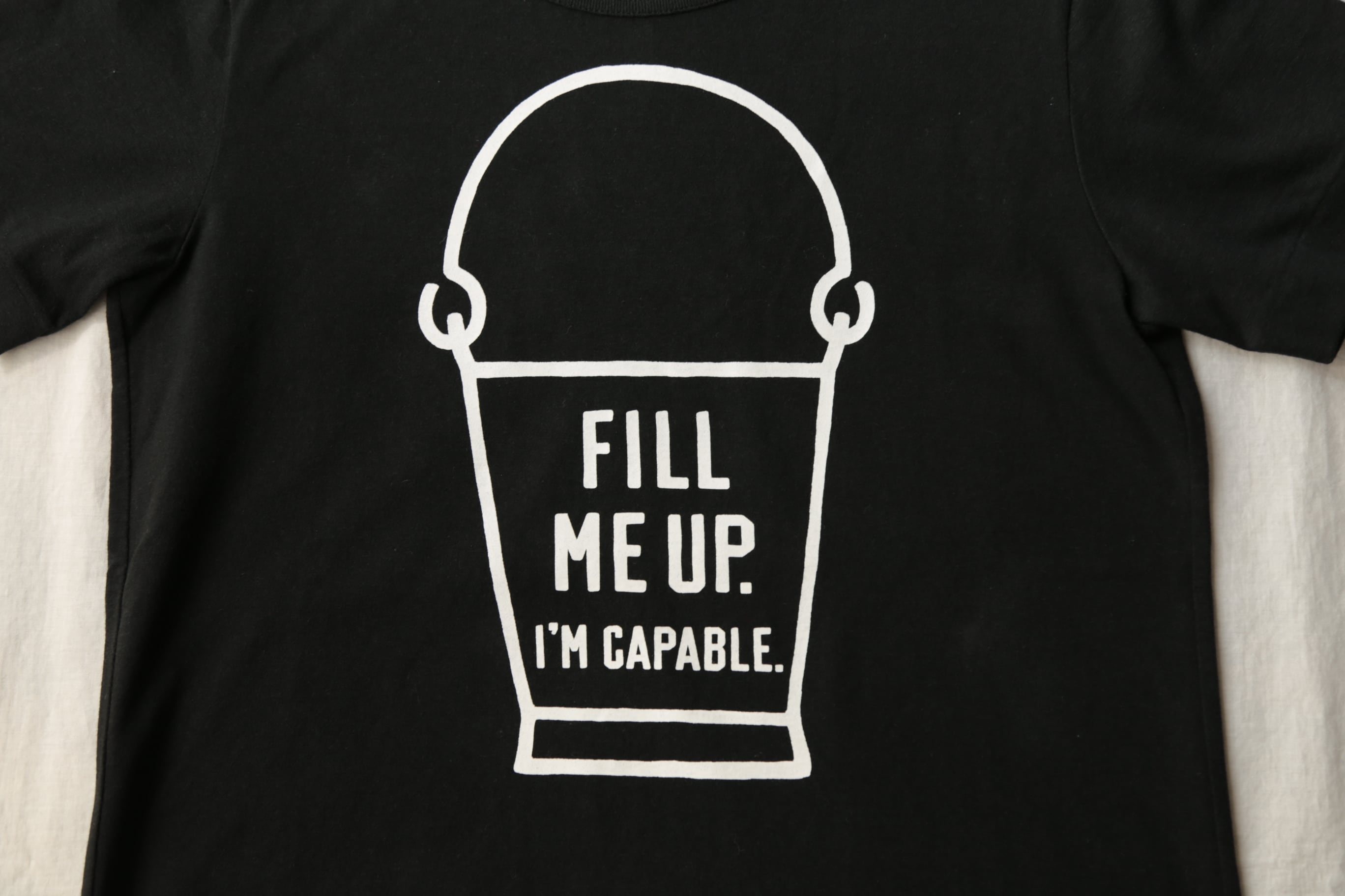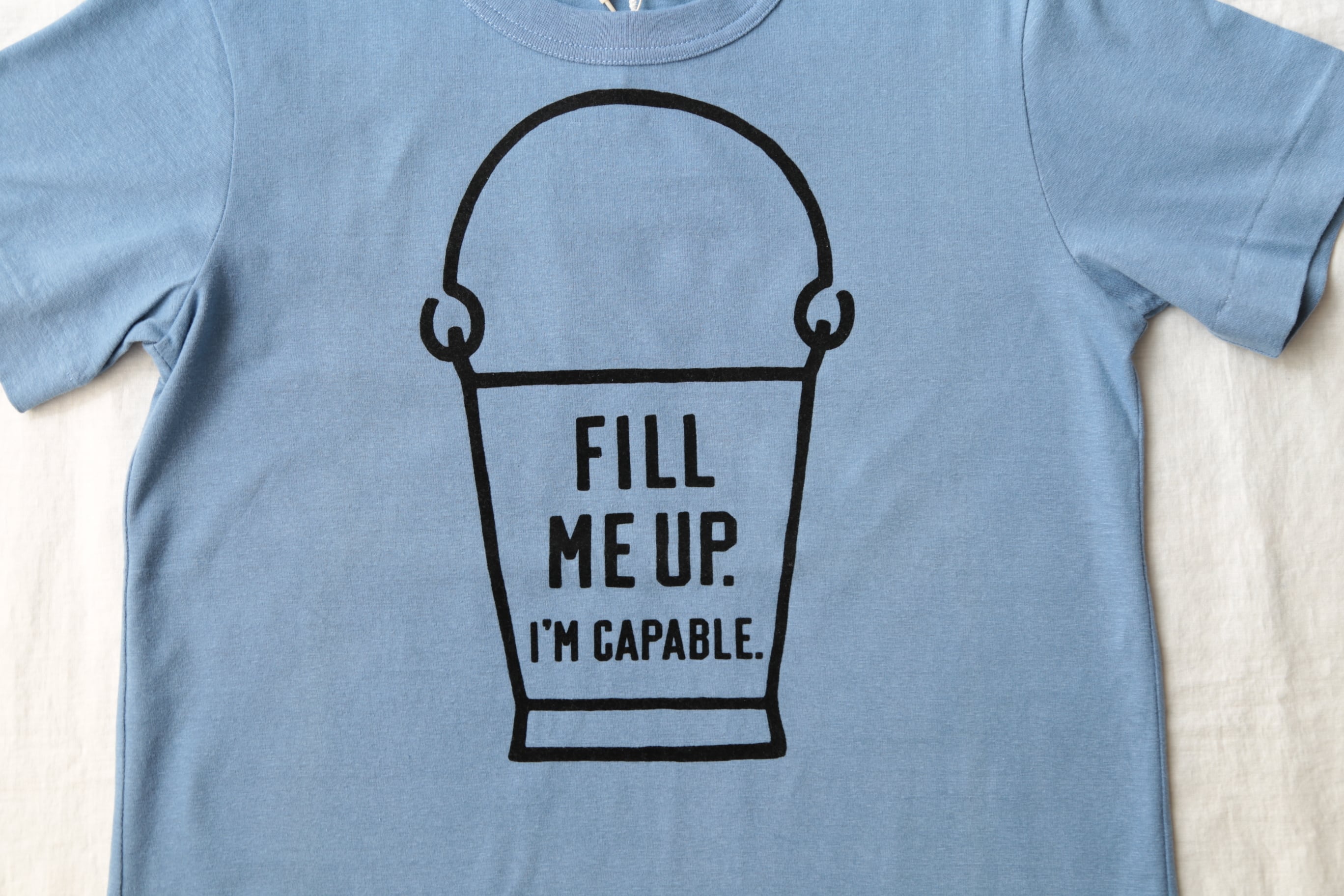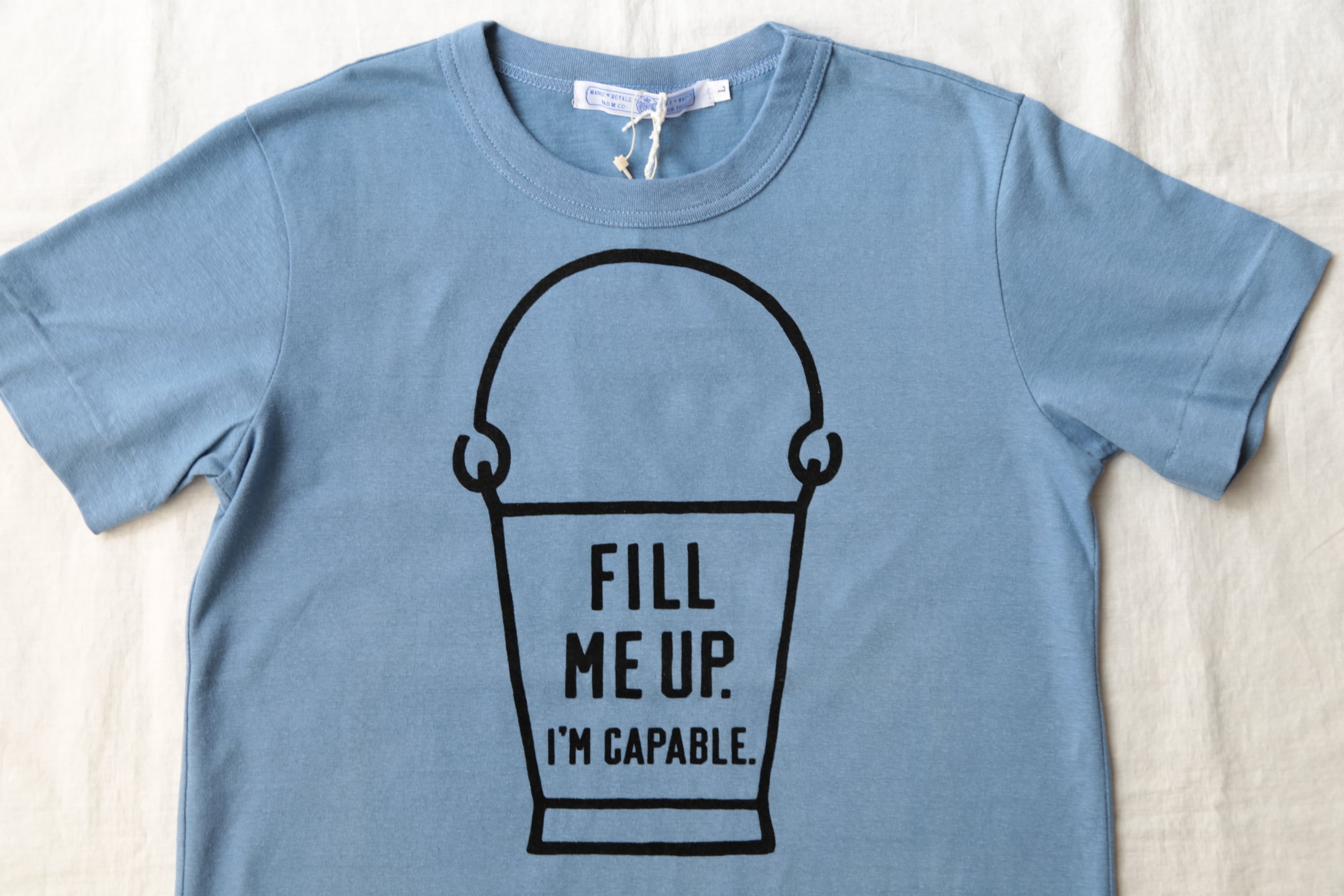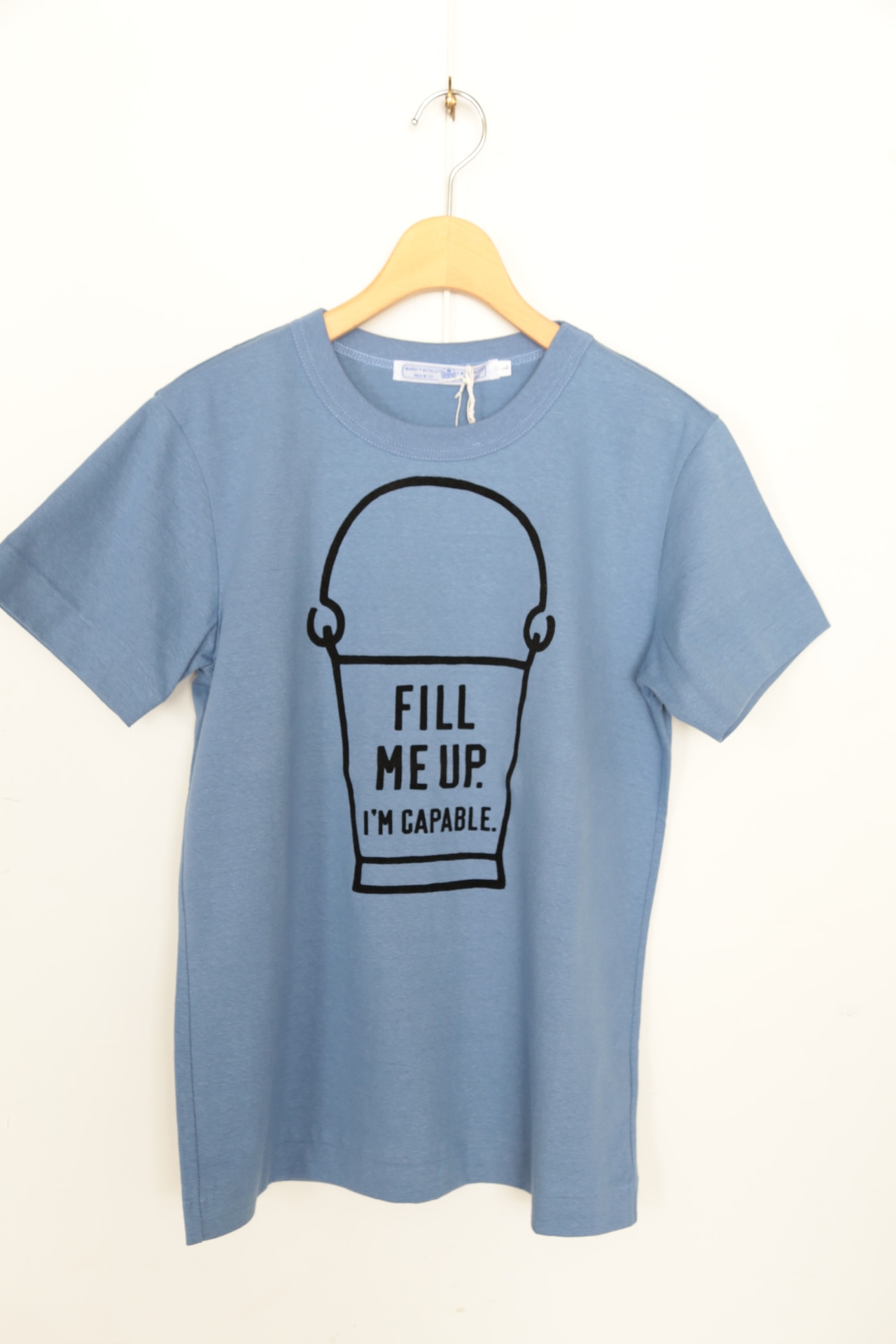 バケツのイラストにFILL ME UP TEEのロゴが際立つFILL ME UP TEE。シンプルでありながら、一度見たら忘れられないキャッチーなデザインが魅力です。大人のためのスタイリッシュなTシャツはデイリーユースにも最適です。どんなボトムスとも相性抜群で、シーンを選ばず着まわせること間違いなし!ぜひこのTシャツをワードローブに加えて様々なスタイルを楽しんでください!