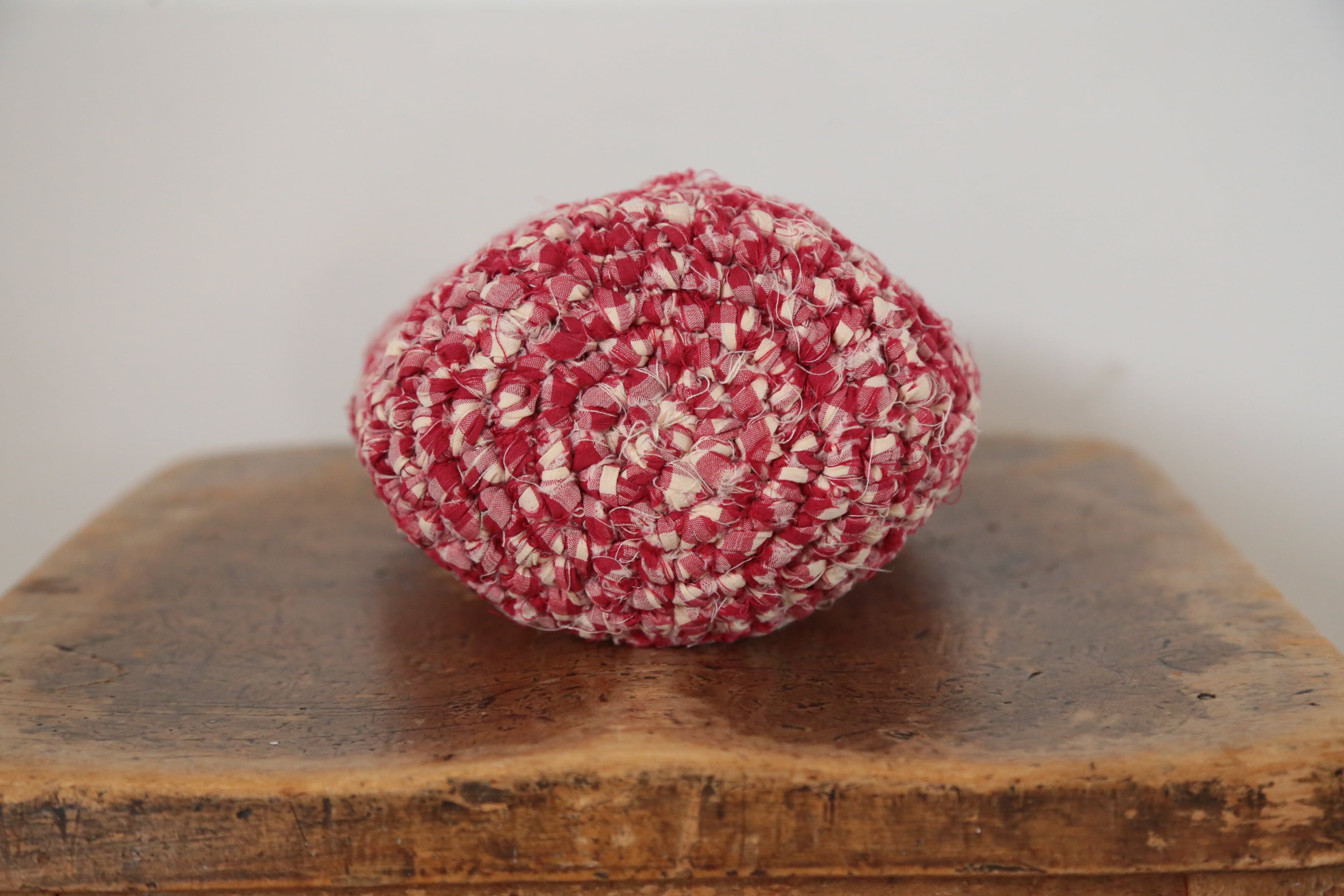 ギンガムチェックの生地を糸状にして手編みで仕上げたG.C RIP STRIP WEAVING BAG。