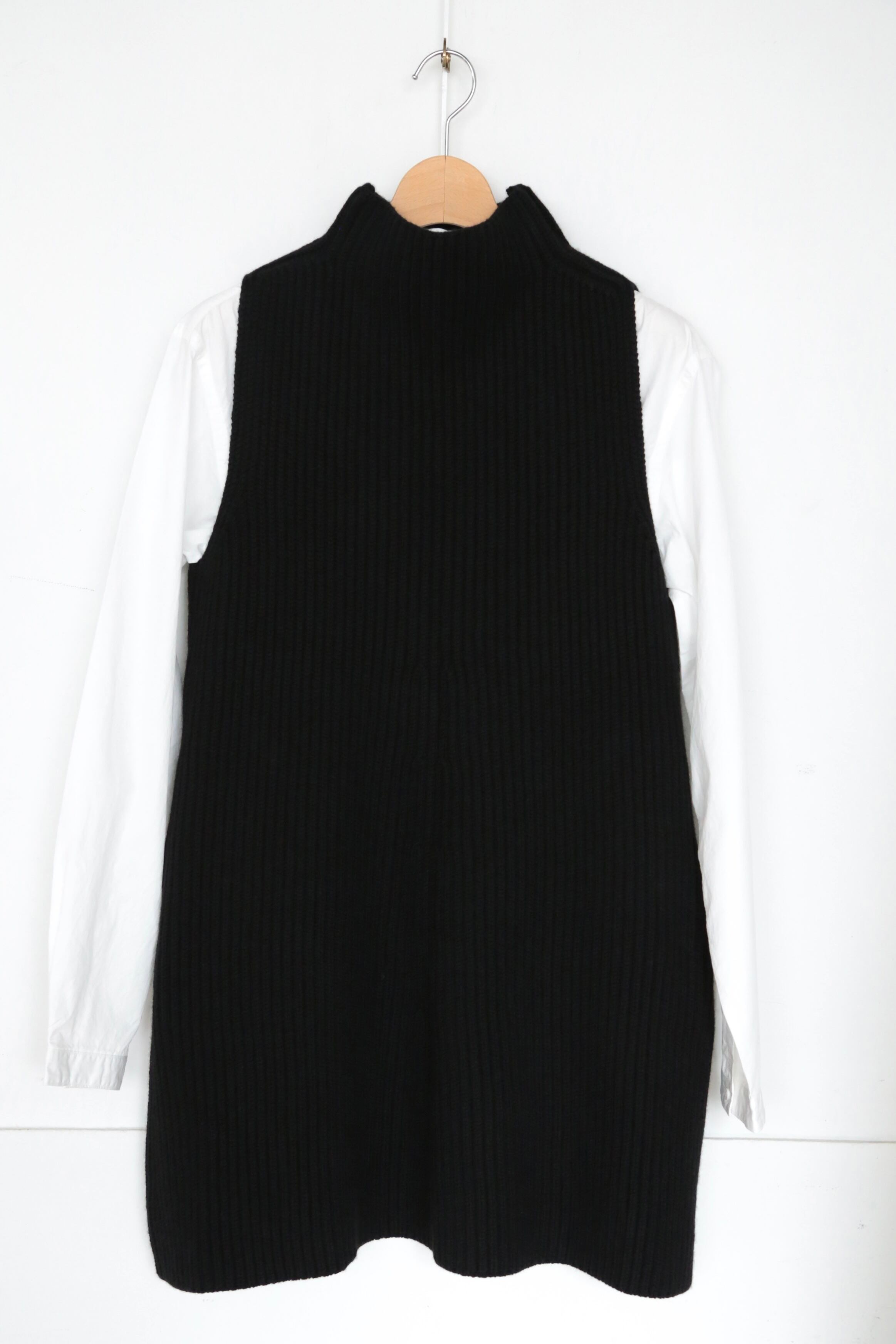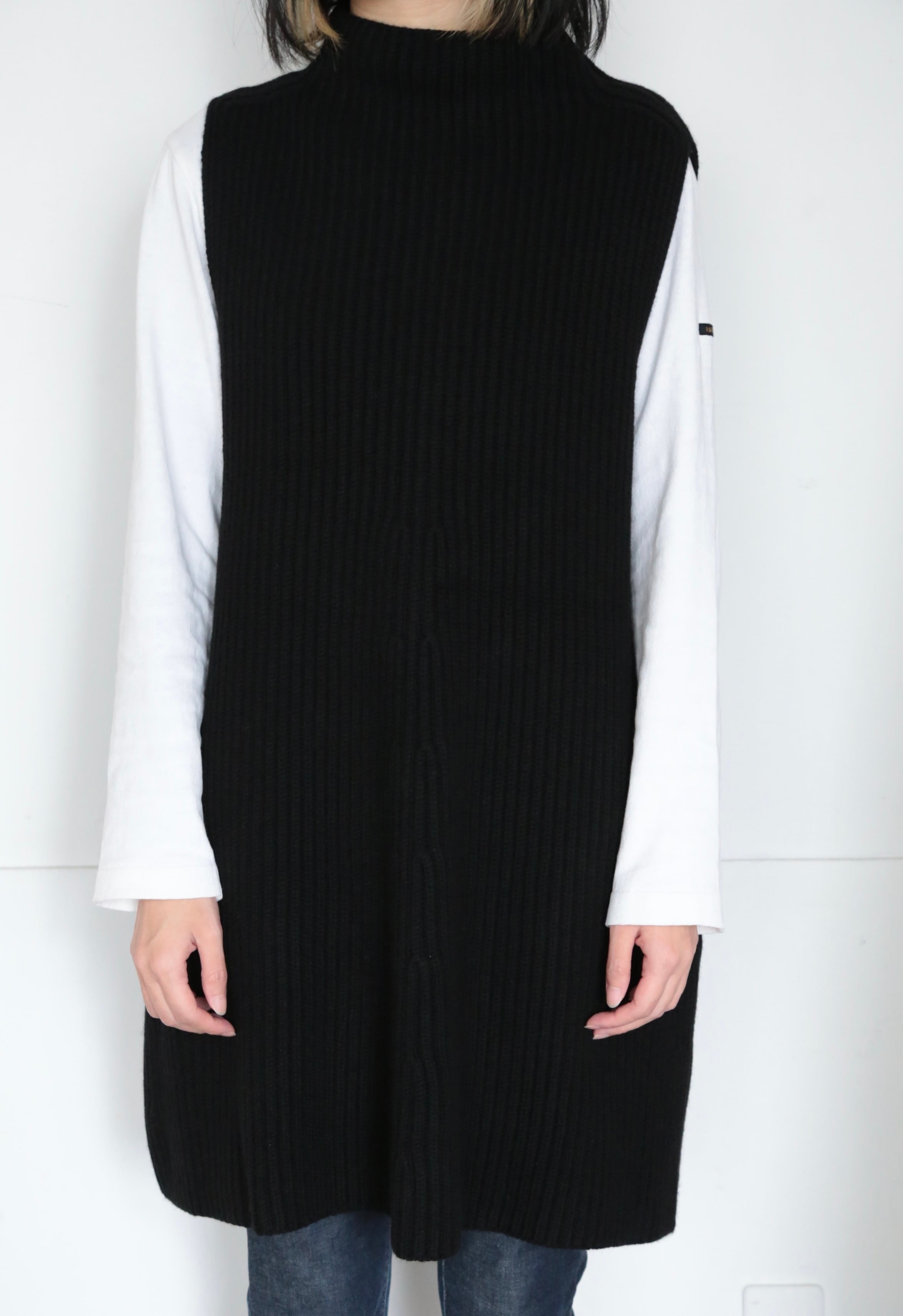 リブ編みのデザインがシンプルながらも美しいシルエットを生み出し、着るだけで優雅な印象を与えます。袖のないデザインは 着合わせを楽しむのにぴったりで、シャツやカットソーとの相性も抜群です。