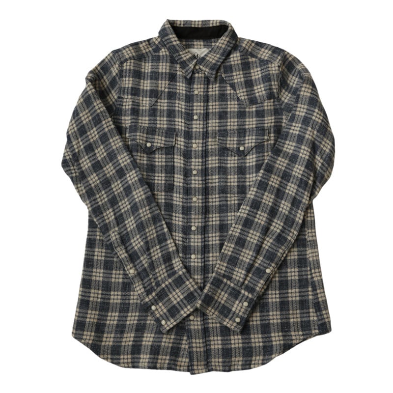 ブルーと生成りののタータンチェックにスナップボタンがアクセントのCHECK WESTERN SHIRTS。ウールとリネンのざっくりとした質感が味のある1着です。
