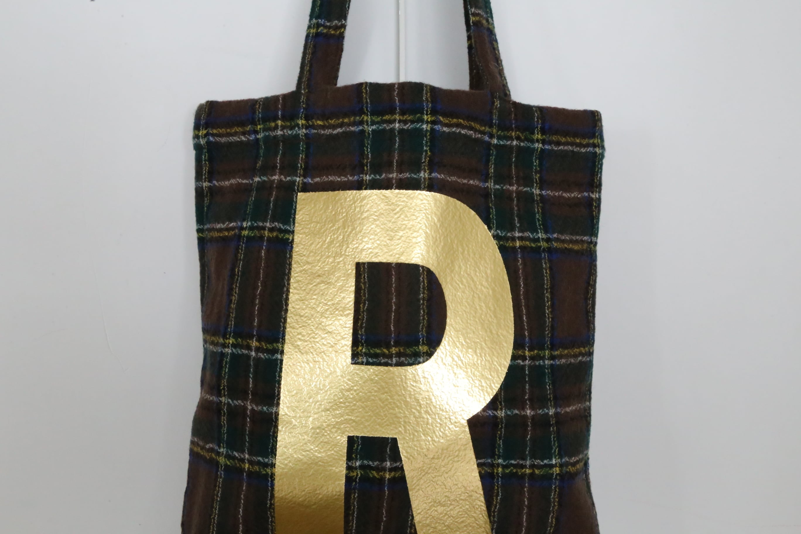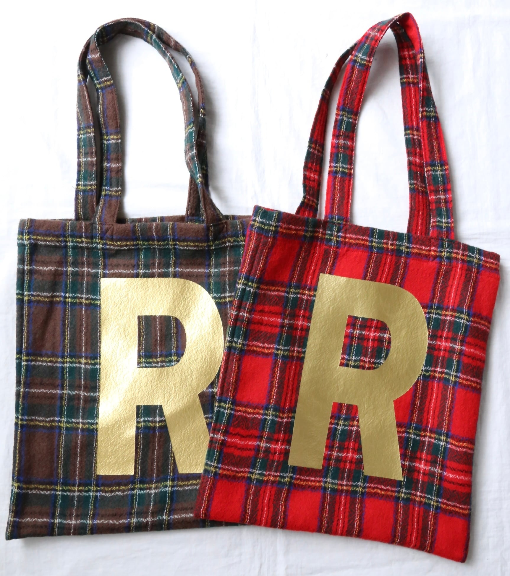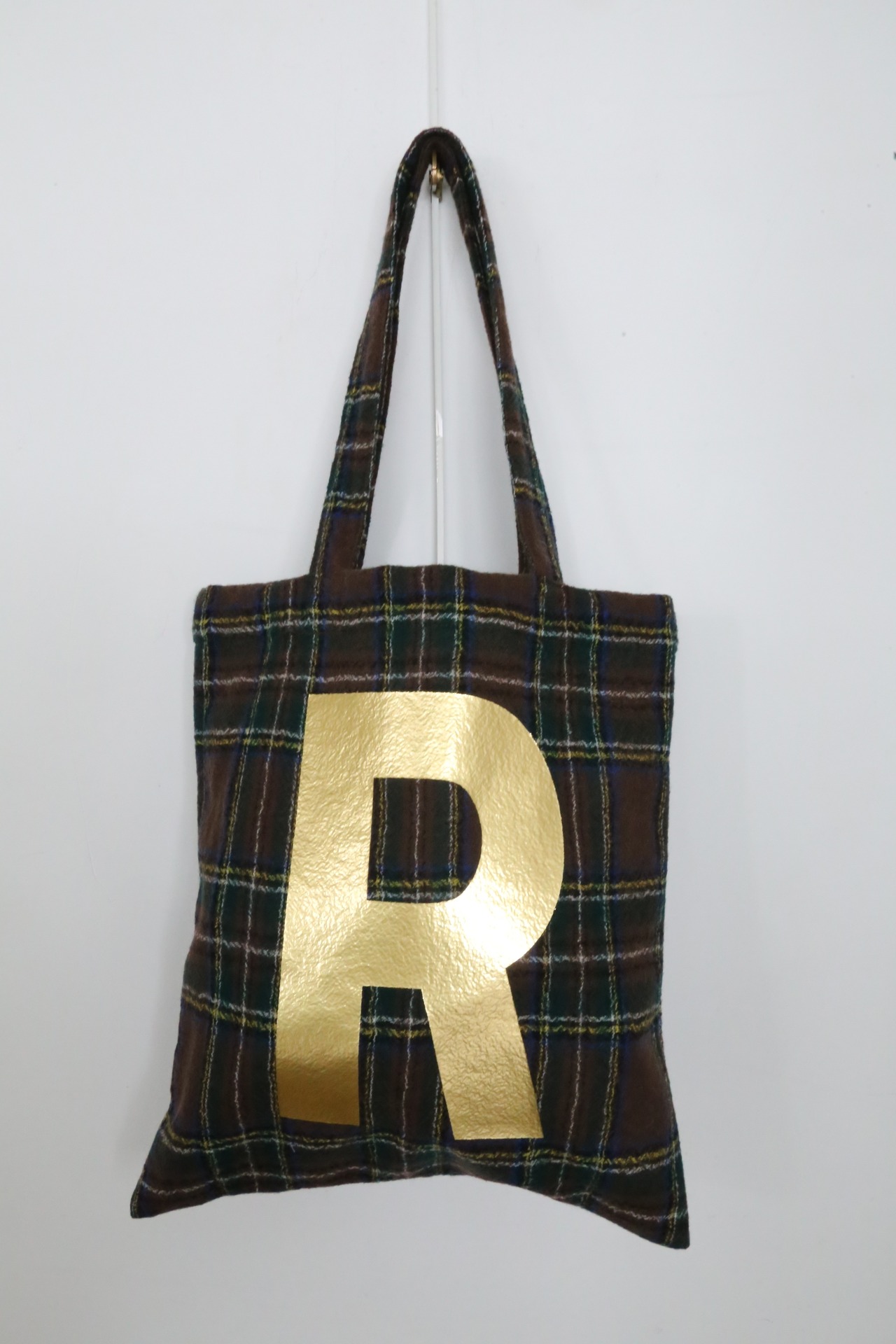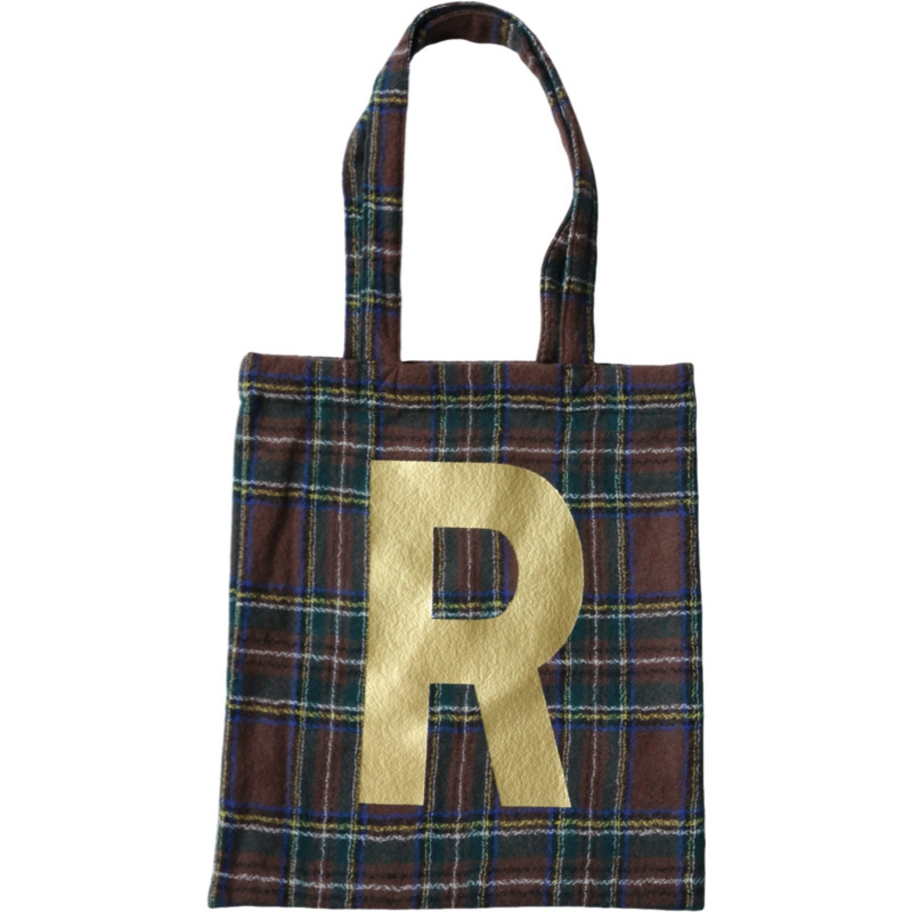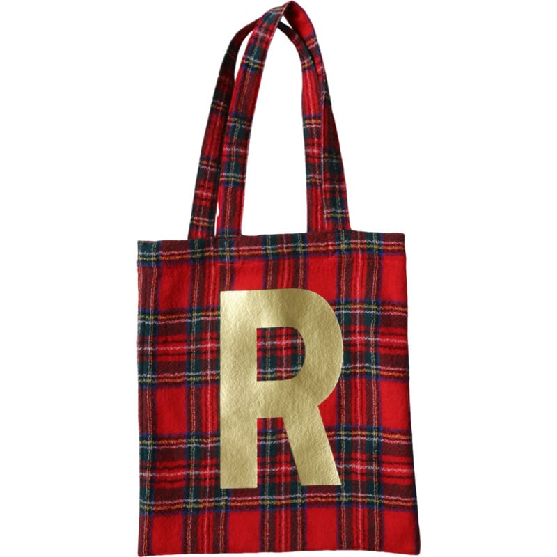 ゴールドのRが個性的なWOOL TARTAN CHECK R TOTE 。