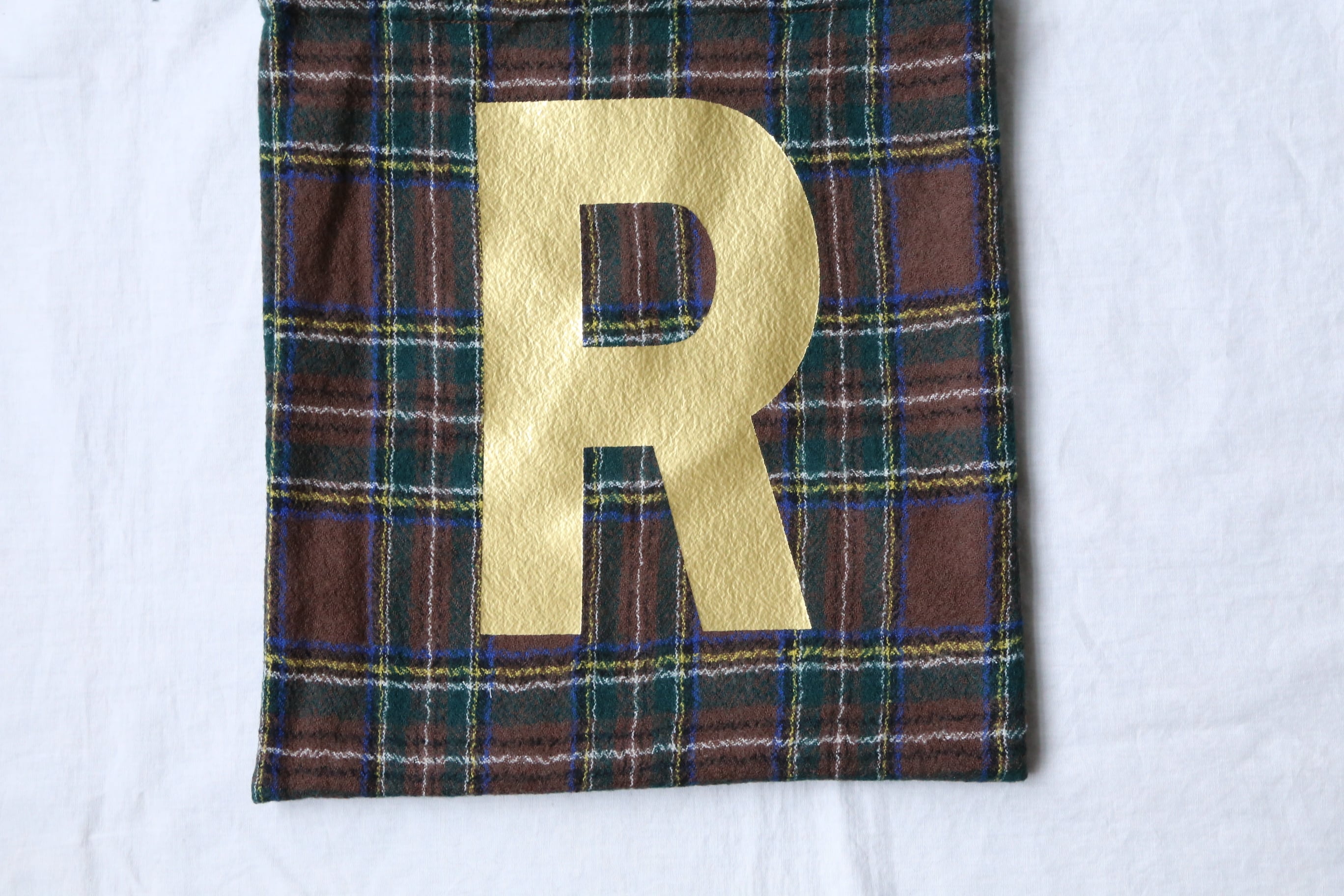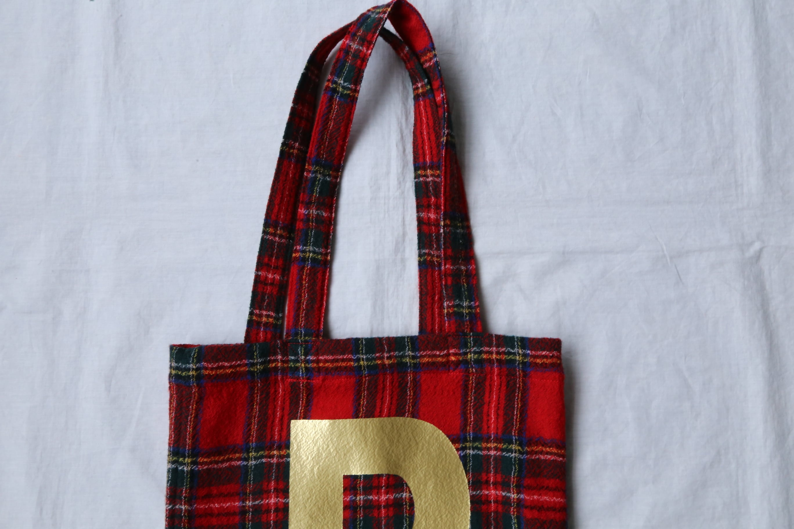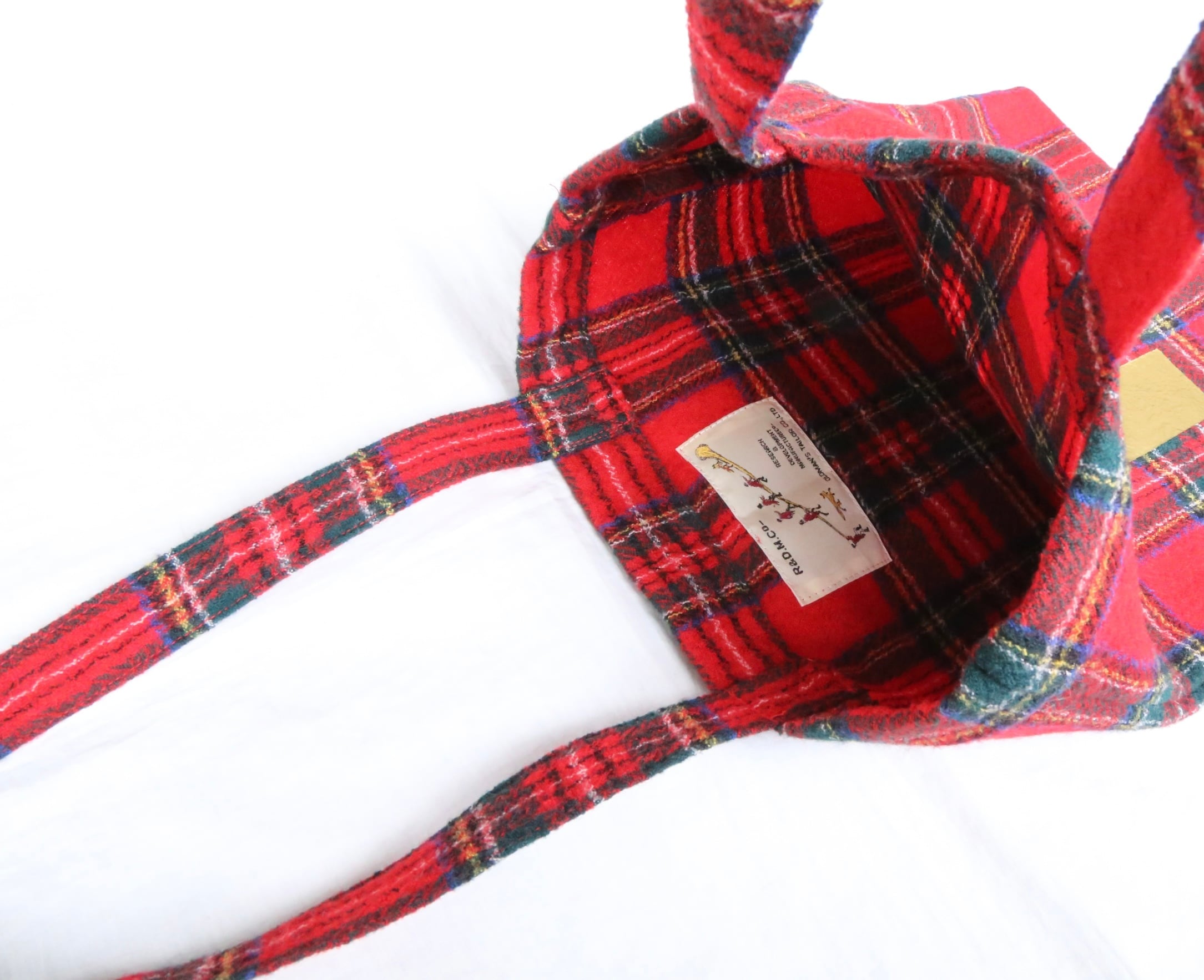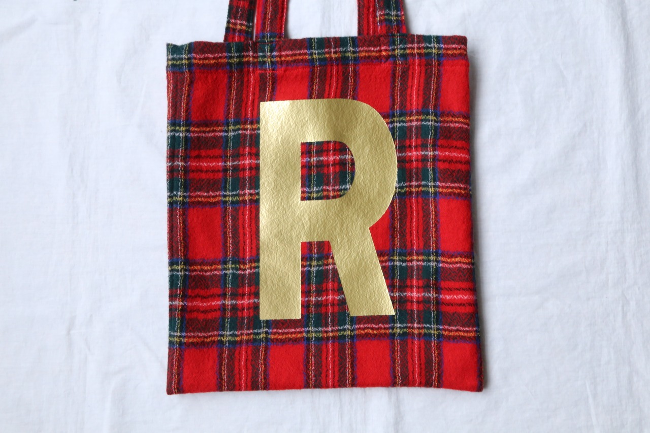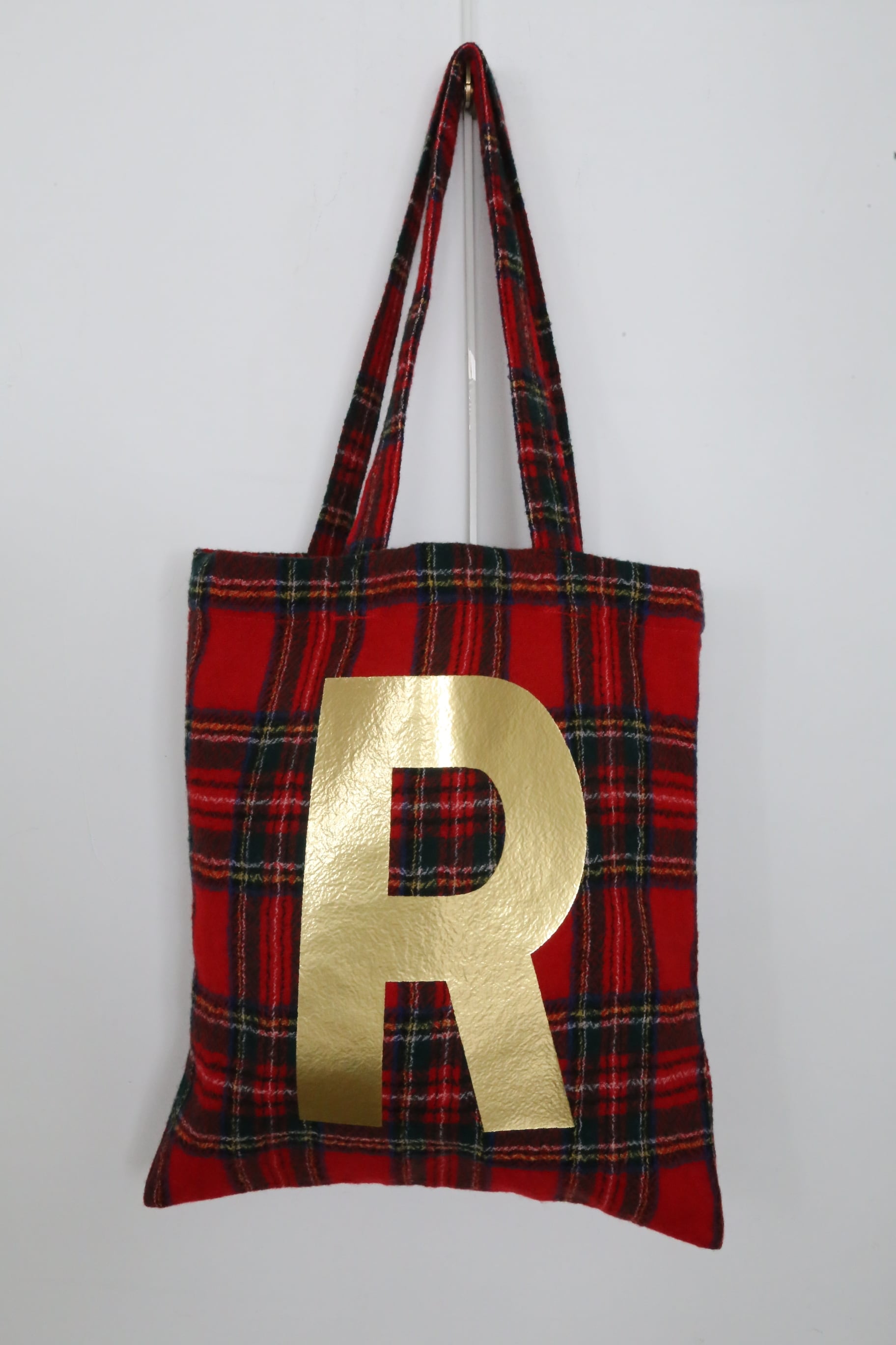 ゴールドのRが個性的なWOOL TARTAN CHECK R TOTE 。