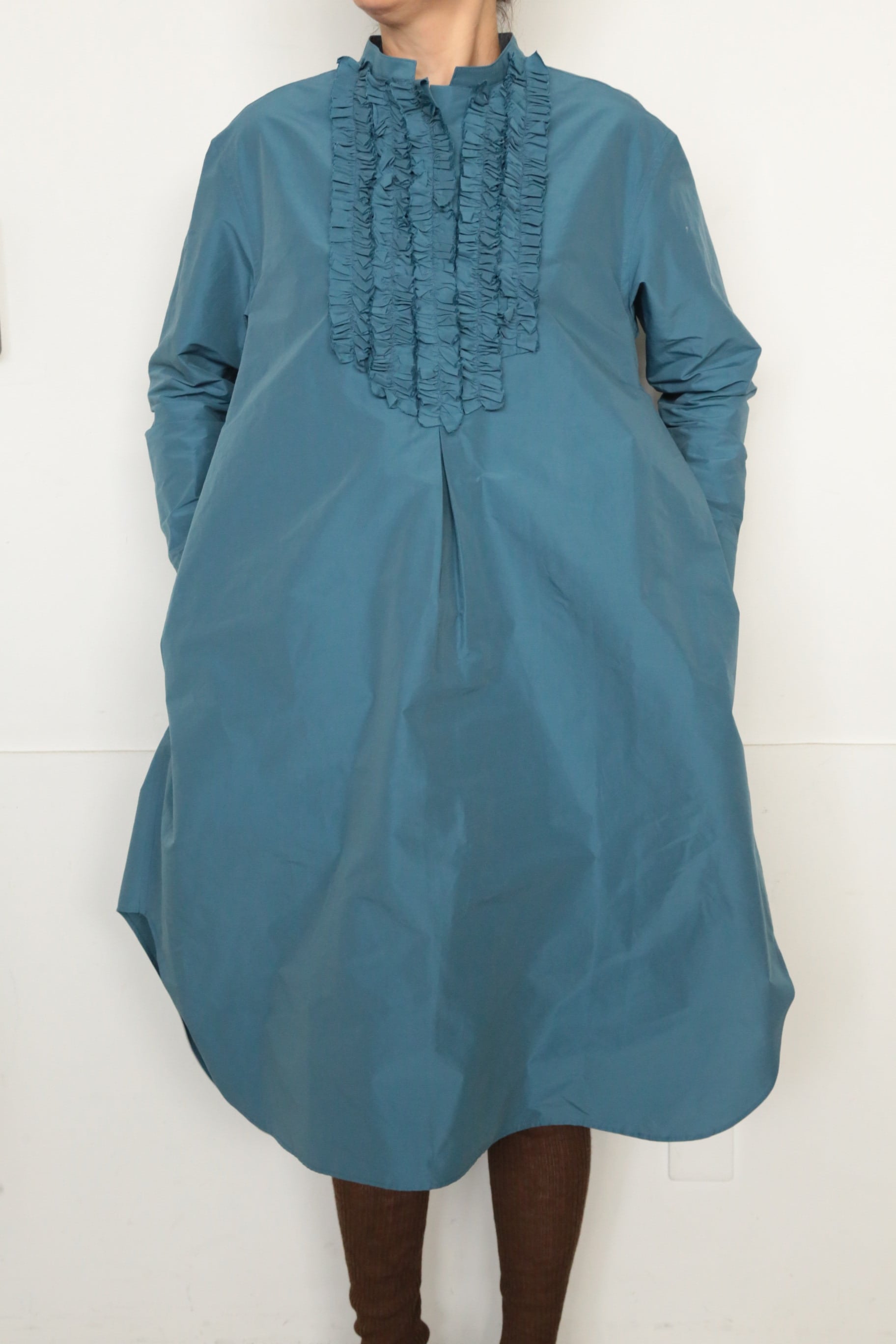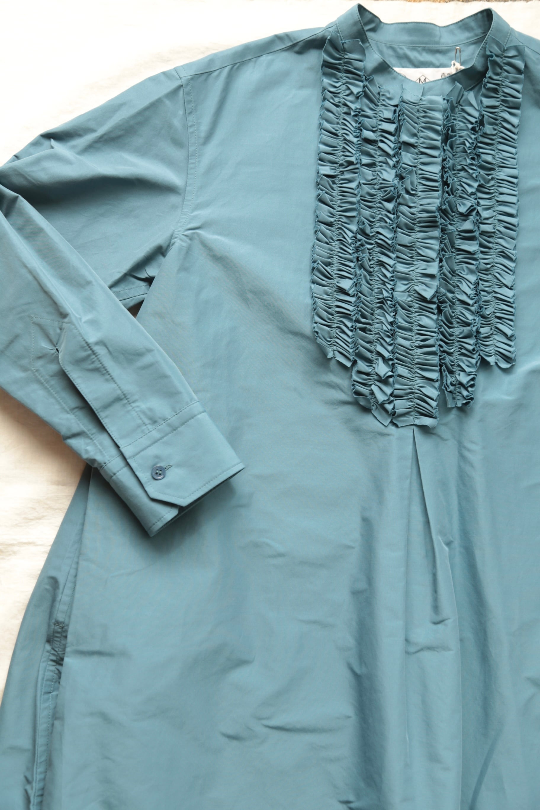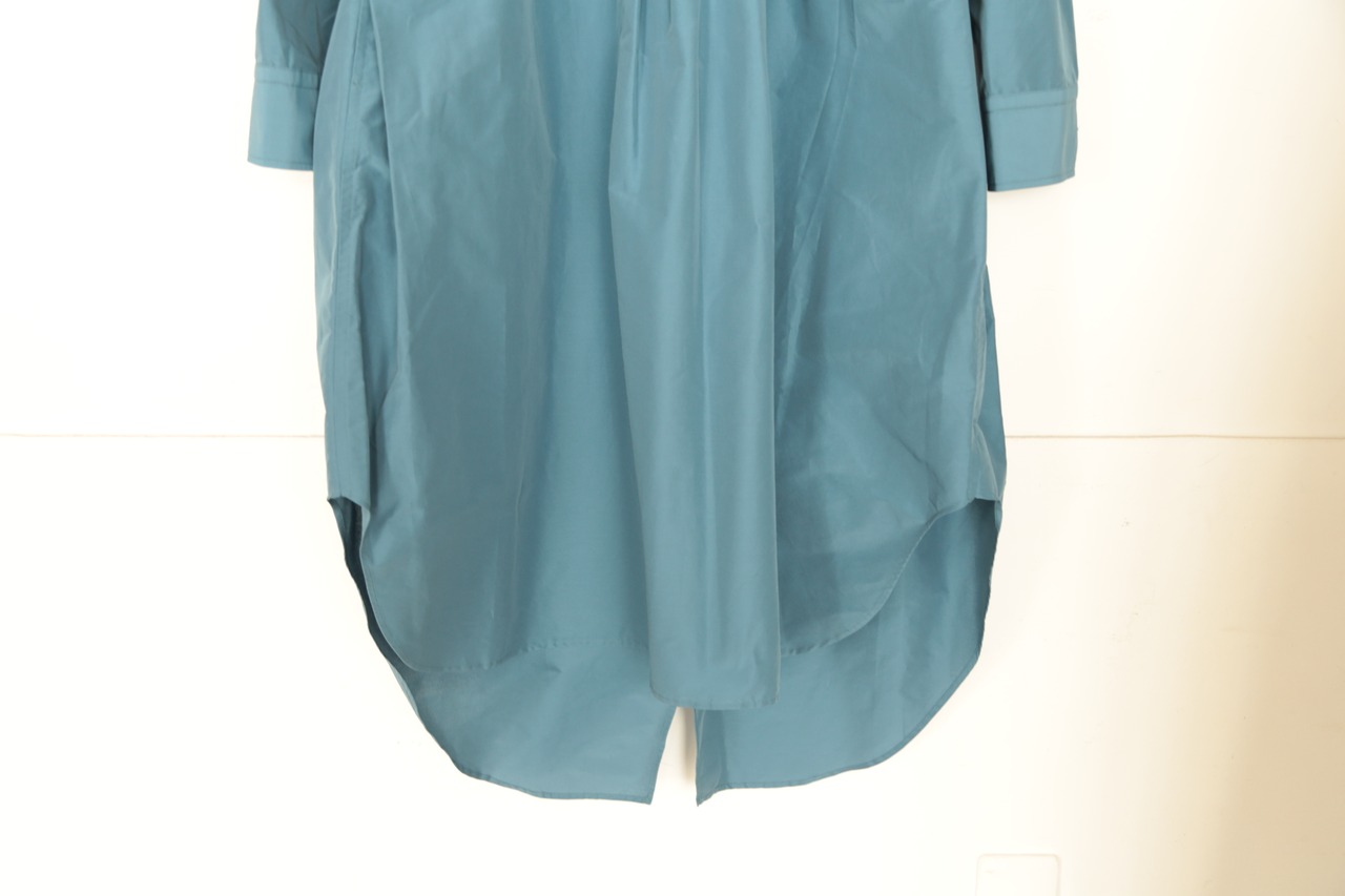 美しいブルーが印象的なTAFFETA SWALLOW TAIL FRILL SHIRT。